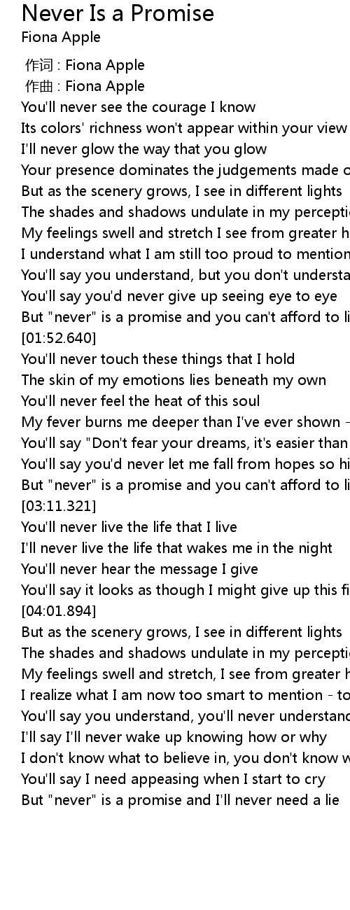 | [01:44.150] | But "never" is a promise and you can't afford to lie |