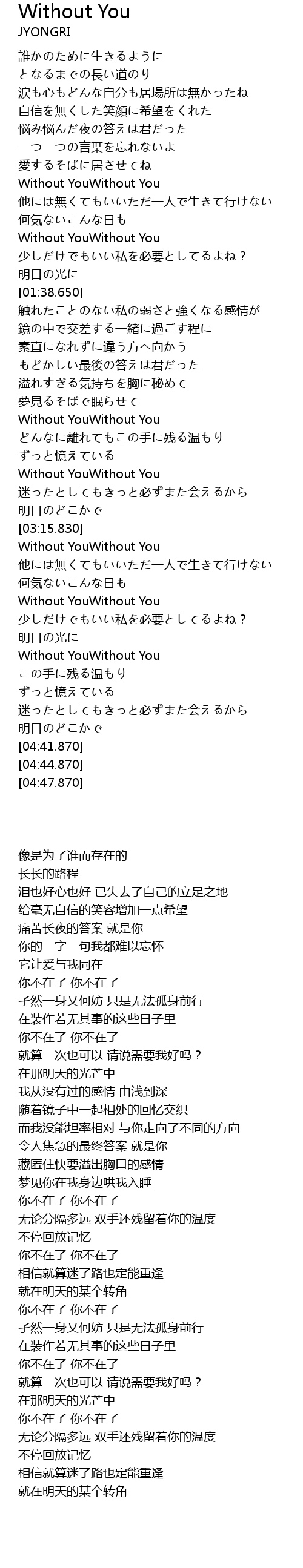 | [01:14.110] | 他には無くてもいいただ一人で生きて行けない |