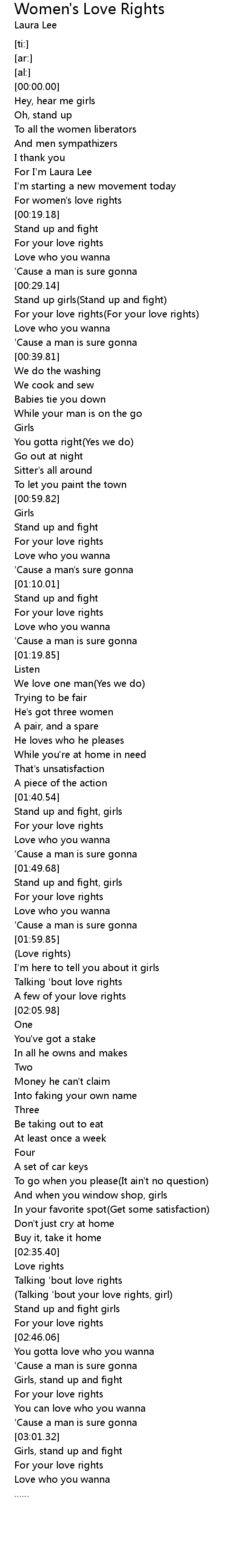 | [00:17.76] | For women' s love rights |
