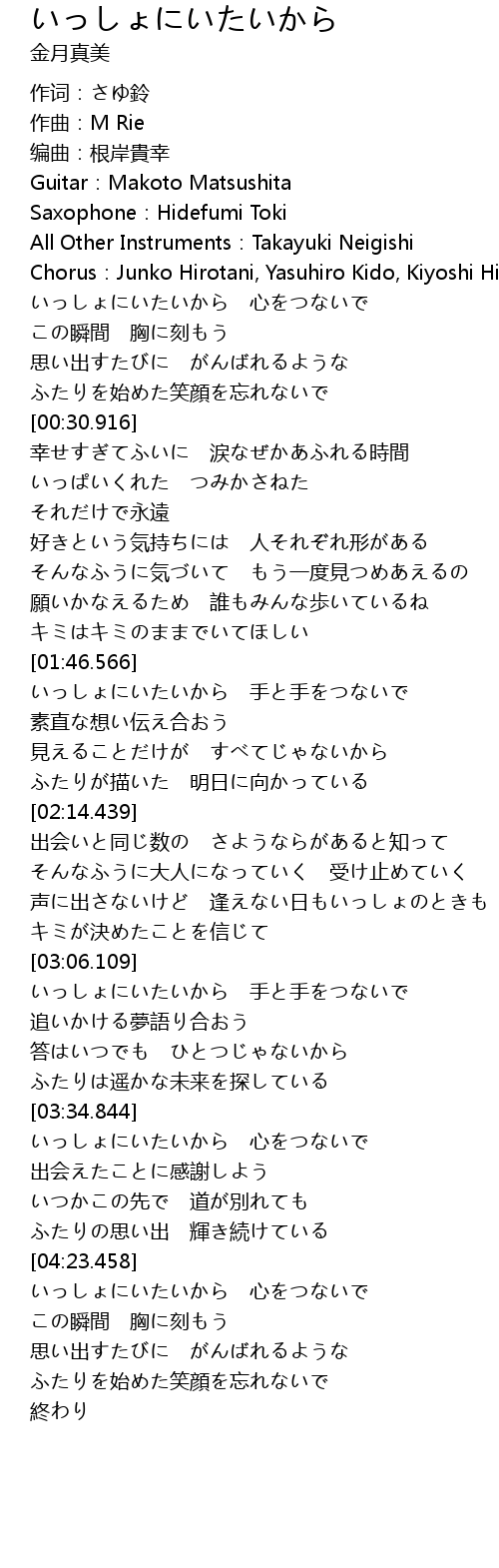 | [03:59.895] | いっしょにいたいから 心をつないで |