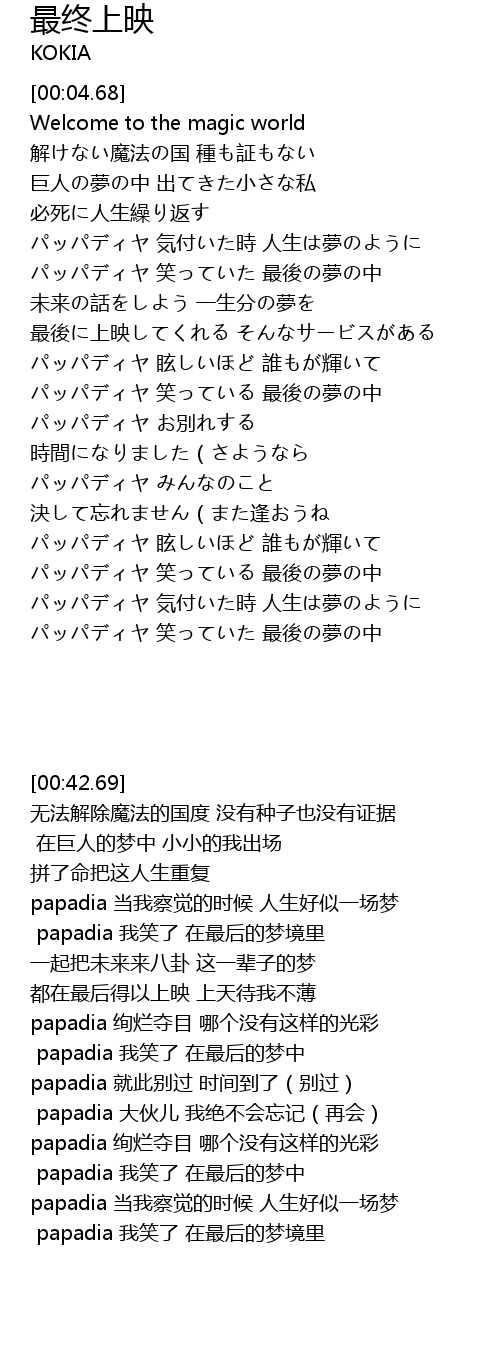 | [04:33.68] | パッパディヤ 笑っていた 最後の夢の中 |