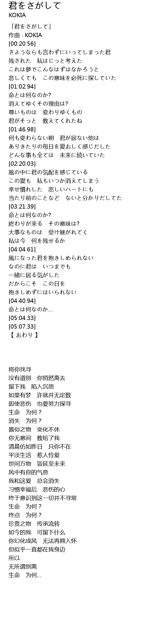 | [00:22.56] | さようならも言わずにいってしまった君 |