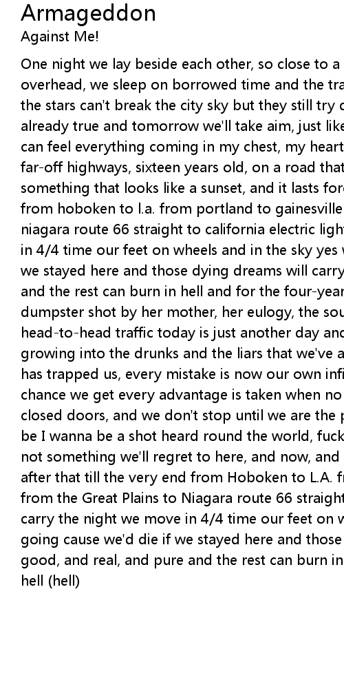 One night we lay beside each other, so close to a sweat with two fans circling overhead, we sleep on borrowed time and the traffic lights direct empty roads, the stars can't break the city sky but they still try despite what they know is already true and tomorrow we'll take aim, just like a storm waiting for a calm I can feel everything coming in my chest, my heart's already pounding my head's on far-off highways, sixteen years old, on a road that never ends might drive into something that looks like a sunset, and it lasts forever, and i never look back from hoboken to l.a. from portland to gainesville from the great plains to niagara route 66 straight to california electric lights carry the night we move in 4/4 time our feet on wheels and in the sky yes we're going cause we'd die if we stayed here and those dying dreams will carry what's good, and real, and pure and the rest can burn in hell and for the four-year-old girl found dead in a dumpster shot by her mother, her eulogy, the sound of construction through head-to-head traffic today is just another day and me and my friends are just growing into the drunks and the liars that we've always hated every shortcoming has trapped us, every mistake is now our own infinite failure so we steal every chance we get every advantage is taken when no one's looking we hide behind closed doors, and we don't stop until we are the people we've decided we should be I wanna be a shot heard round the world, fucking unstoppable this distance is not something we'll regret to here, and now, and then, and forever, and days after that till the very end from Hoboken to L.A. from Portland to Gainesville from the Great Plains to Niagara route 66 straight to California electric lights carry the night we move in 4/4 time our feet on wheels and in the sky yes we're going cause we'd die if we stayed here and those dying dreams will carry what's good, and real, and pure and the rest can burn in hell and the rest can burn in hell (hell) |