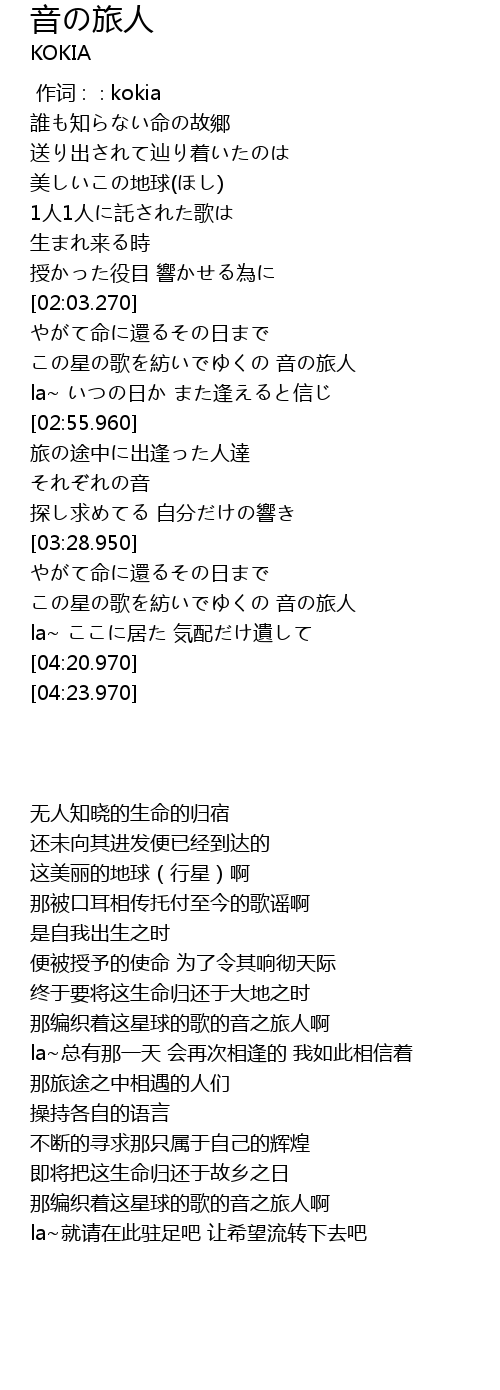 | [03:42.210] | この星の歌を紡いでゆくの 音の旅人 |
