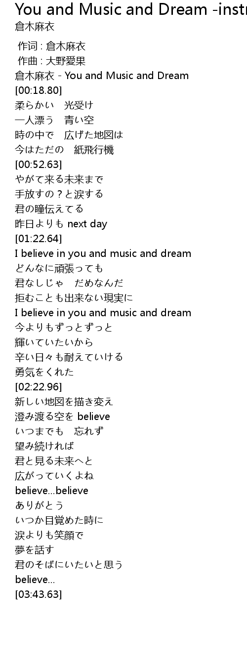 | [00:02.80] | 倉木麻衣 - You and Music and Dream |