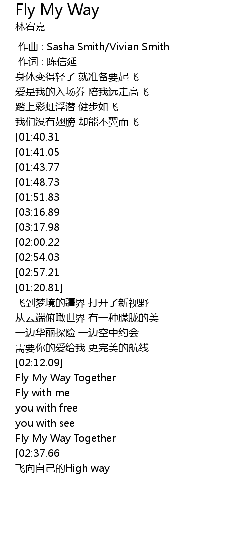 | [03:29.11][02:57.21][02:07.93][01:15.63] | You' re Gonna Fly My Way |