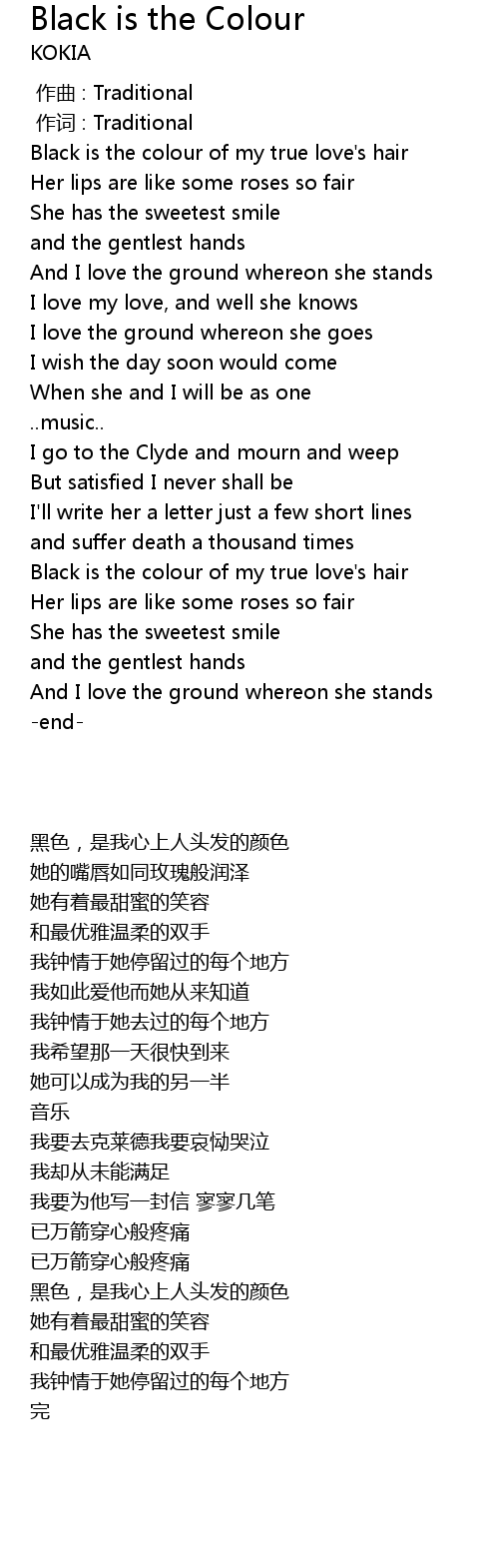 | [00:08.730] | Black is the colour of my true love' s hair |