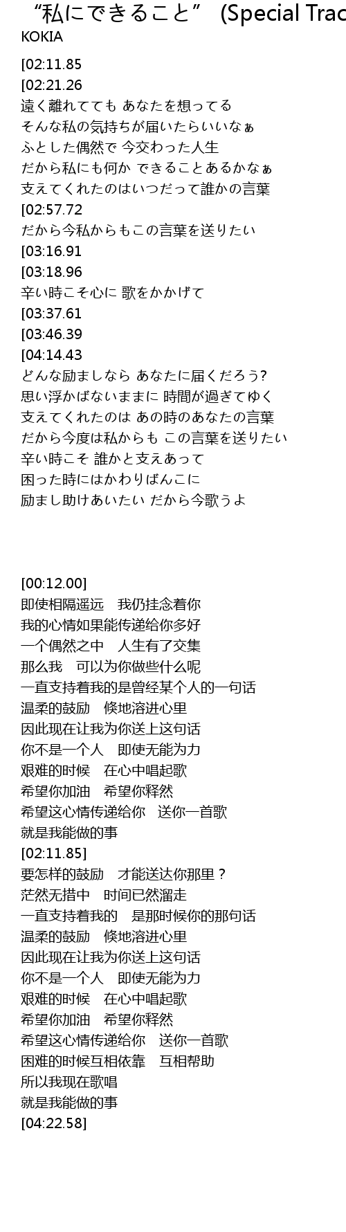 | [00:12.00][02:11.85][04:22.58] | KOKIA-私にできること |