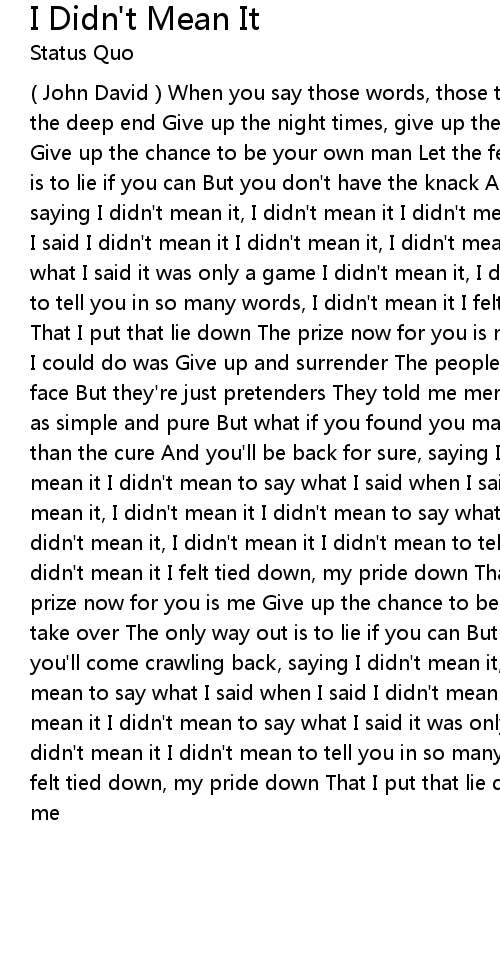 ( John David ) When you say those words, those three little words You're in at the deep end Give up the night times, give up the high times Give up the weekend Give up the chance to be your own man Let the feeling take over The only way out is to lie if you can But you don't have the knack And you'll come crawling back, saying I didn't mean it, I didn't mean it I didn't mean to say what I said when I said I didn't mean it I didn't mean it, I didn't mean it I didn't mean to say what I said it was only a game I didn't mean it, I didn't mean it I didn't mean to tell you in so many words, I didn't mean it I felt tied down, my pride down That I put that lie down The prize now for you is me Well I was like you and all I could do was Give up and surrender The people can trace what they did in my face But they're just pretenders They told me mercenary action today Is a line as simple and pure But what if you found you made a mistake The medicine's worse than the cure And you'll be back for sure, saying I didn't mean it, I didn't mean it I didn't mean to say what I said when I said I didn't mean it I didn't mean it, I didn't mean it I didn't mean to say what I said it was only a game I didn't mean it, I didn't mean it I didn't mean to tell you in so many words, I didn't mean it I felt tied down, my pride down That I put that lie down The prize now for you is me Give up the chance to be your own man Let the feeling take over The only way out is to lie if you can But you don't have the knack And you'll come crawling back, saying I didn't mean it, I didn't mean it I didn't mean to say what I said when I said I didn't mean it I didn't mean it, I didn't mean it I didn't mean to say what I said it was only a game I didn't mean it, I didn't mean it I didn't mean to tell you in so many words, I didn't mean it I felt tied down, my pride down That I put that lie down The prize now for you is me |