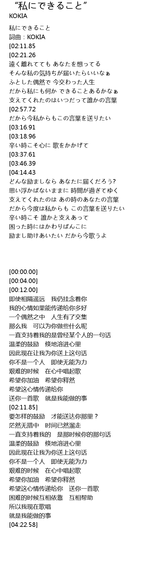 | [00:12.00][02:11.85][04:22.58] | KOKIA-私にできること |