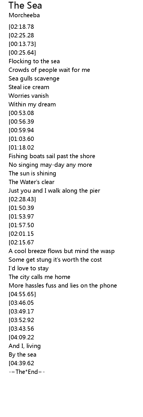 | [04:42.83][02:18.78][01:21.24][00:00.00] | Morcheeba The Sea |