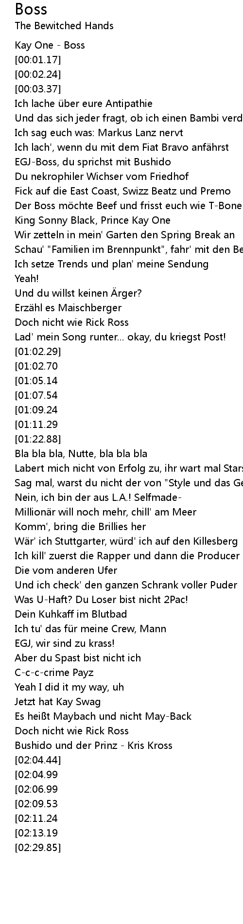 | [02:14.85][02:04.99] | Cash, Nutten, Macht, Fame, Sportwagen |