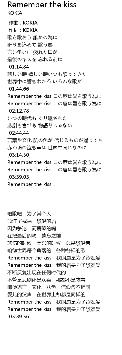 | [03:14.95] | Remember the kiss chún ài gē wèi |
