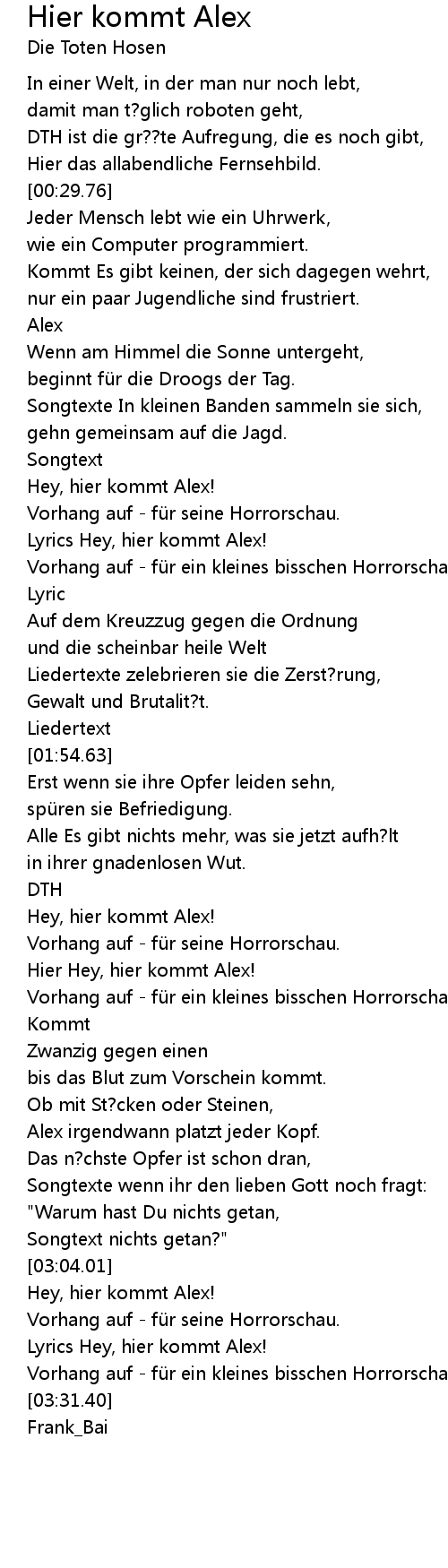 | [01:15.57] | Lyrics Hey, hier kommt Alex! |