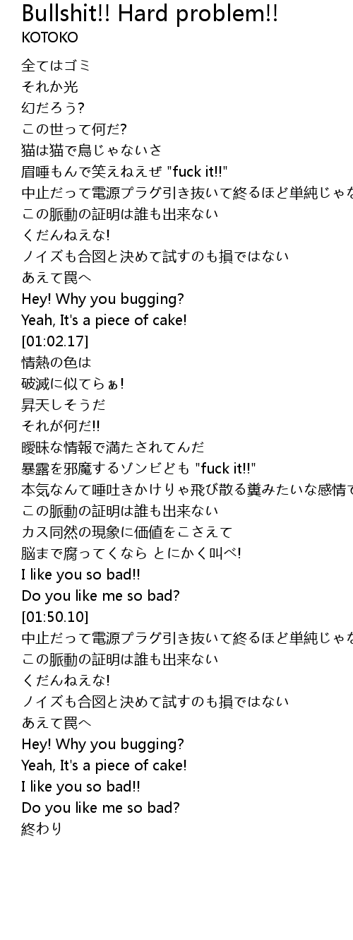 | [00:34.62] | 眉唾もんで笑えねえぜ "fuck it!!" |