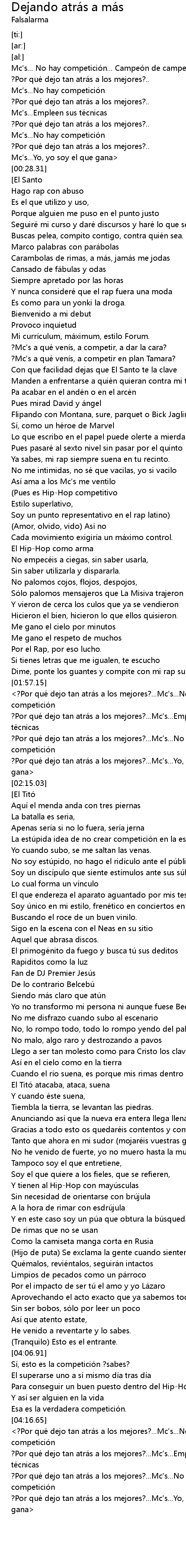 | [00:54.32] | ?Mc′s a qué venís, a competir, a dar la cara? |