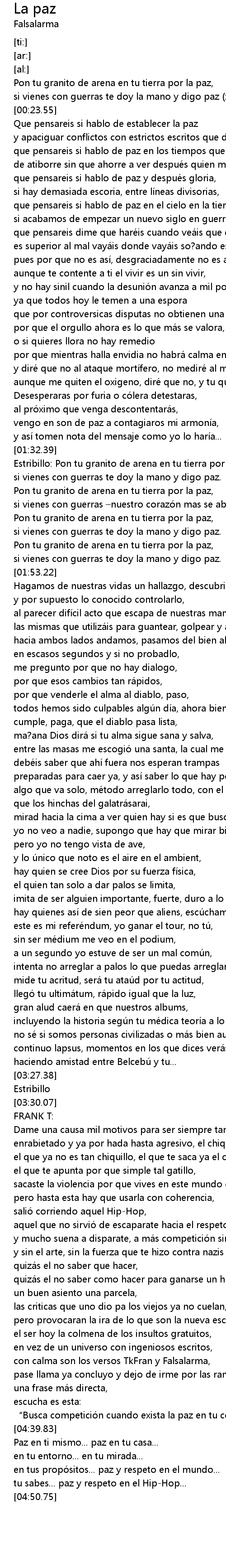 | [00:36.37] | que pensareis si hablo de paz en los tiempos que corren |