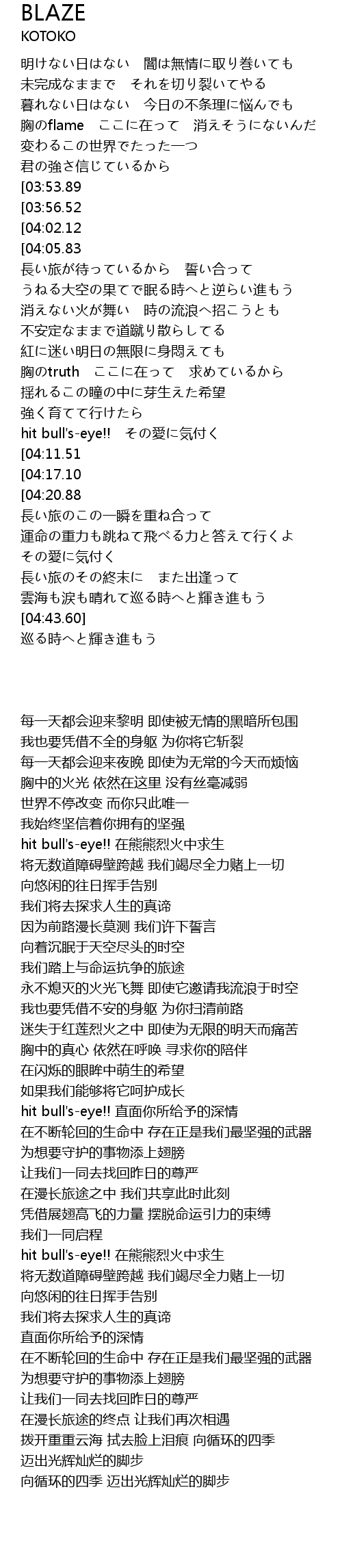 | [01:14.52][03:53.89] | hit bull's-eye!! 火の中で生きる |