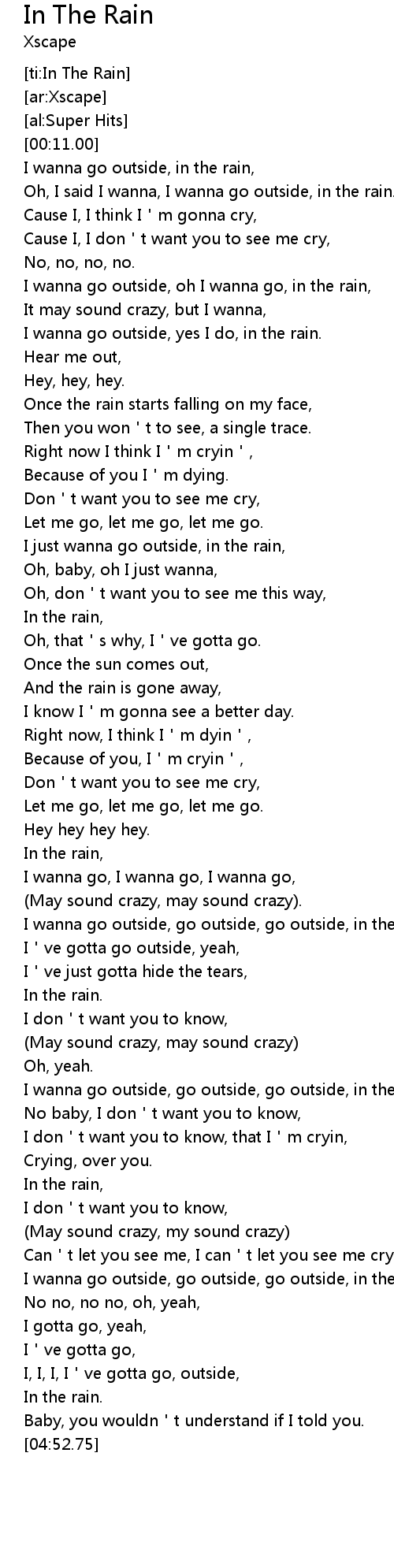 | [00:45.63] | Oh, I said I wanna, I wanna go outside, in the rain. |