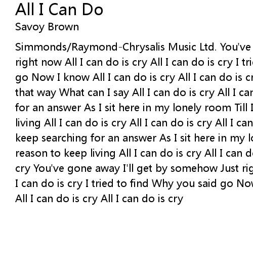 Simmonds/Raymond-Chrysalis Music Ltd. You've gone away I'll get by somehow Just right now All I can do is cry All I can do is cry I tried to find Why you said go Now I know All I can do is cry All I can do is cry Tell me why You walked out that way What can I say All I can do is cry All I can do is cry I keep searching for an answer As I sit here in my lonely room Till I find a reason to keep living All I can do is cry All I can do is cry All I can do is cry....Yeah I keep searching for an answer As I sit here in my lonely room Till I find an reason to keep living All I can do is cry All I can do is cry All I can do is cry You've gone away I'll get by somehow Just right now All I can do is cry All I can do is cry I tried to find Why you said go Now I know All I can do is cry All I can do is cry All I can do is cry