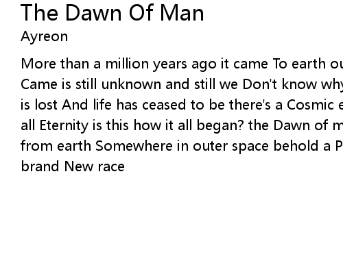 | More than a million years ago it came To earth out of the sky from whence it Came is still unknown and still we Don't know why Way beyond infinity where time is lost And life has ceased to be there's a Cosmic entity a bringer of life for all Eternity is this how it all began? the Dawn of man More than a million miles from earth Somewhere in outer space behold a Planetary birth making way for a brand New race |