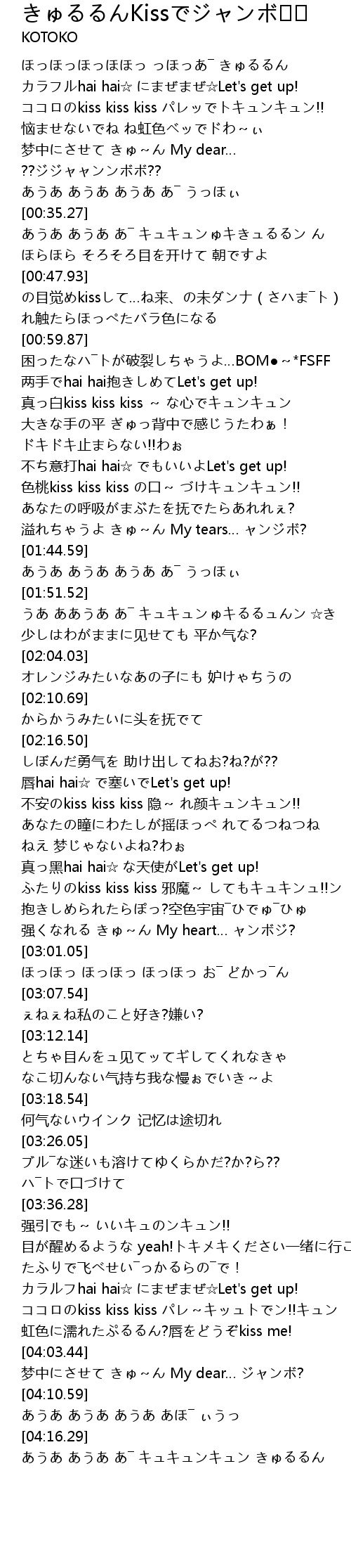 | [03:54.15] | ココロのkiss kiss kiss パレ~キッュトでン!!キュン |