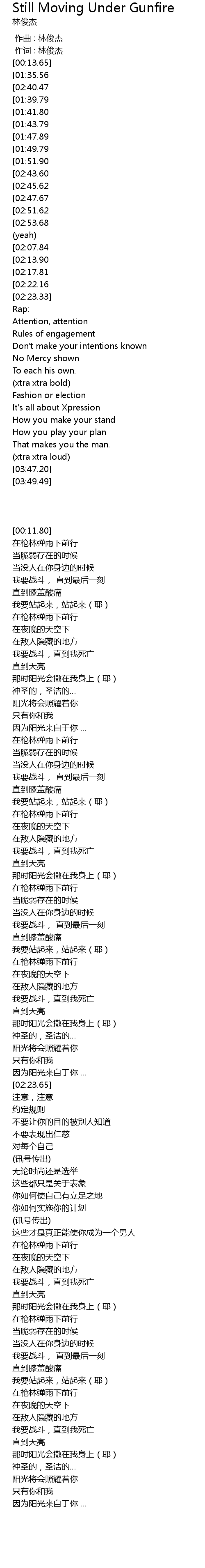 | [02:55.89][02:40.47][01:35.86][01:04.45][00:15.82] | Still moving under gunfire |