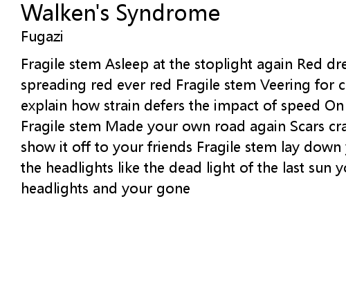 | Fragile stem Asleep at the stoplight again Red dressed in red drenched in red spreading red ever red Fragile stem Veering for control again Change lanes explain how strain defers the impact of speed On on past gone gone gone past on Fragile stem Made your own road again Scars crash and glass made You laugh you'd show it off to your friends Fragile stem lay down your arms and then Steer into the headlights like the dead light of the last sun you'll see Steering into headlights and your gone |