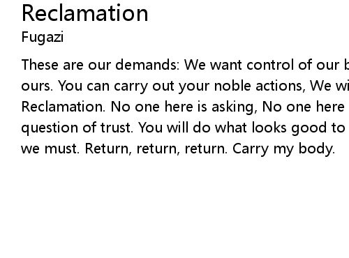 | These are our demands: We want control of our bodies. Decisions will now be ours. You can carry out your noble actions, We will carry our noble scars. Reclamation. No one here is asking, No one here is asking, But there is a question of trust. You will do what looks good to you on paper, We will do what we must. Return, return, return. Carry my body. |