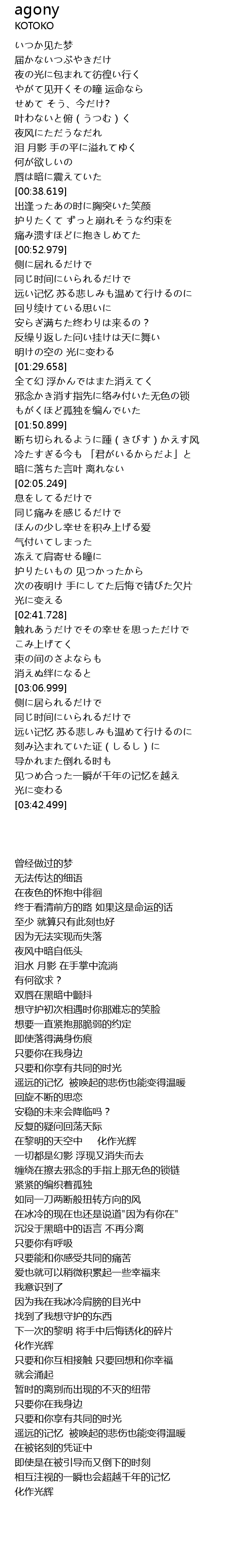 | [02:27.989] | 次の夜明け 手にしてた后悔で锖びた欠片 |