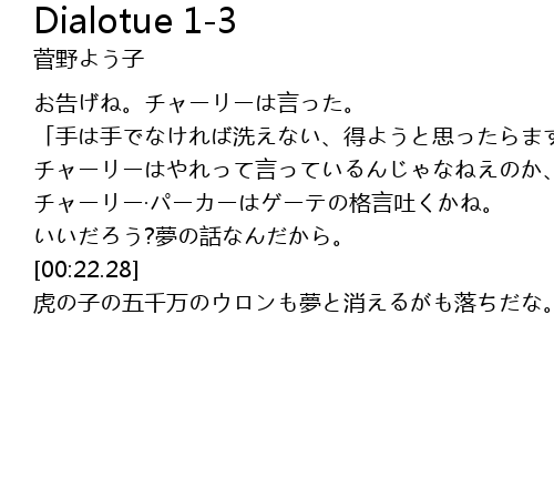 | [00:16.21] | チャーリー·パーカーはゲーテの格言吐くかね。 |