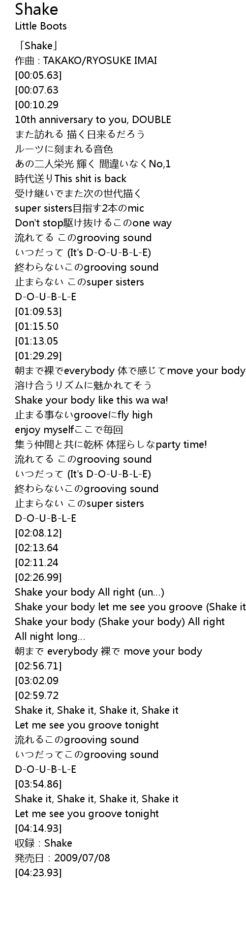 | [03:11.80][03:02.09][02:57.35] | Shake it, Shake it, Shake it, Shake it |