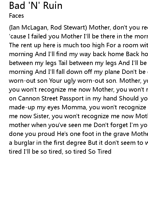 (Ian McLagan, Rod Stewart) Mother, don't you recognize your son? Coming home, 'cause I failed you Mother I'll be there in the morning If you'll have me back The rent up here is much too high For a room without a tap I'll be early in the morning And I'll find my way back home Back home bad 'n' ruin With my tail between my legs Tail between my legs And I'll be so tired I'll be early tomorrow morning And I'll fall down off my plane Don't be embarrassed mother By your ugly worn-out son Your ugly worn-out son. Mother, you won't recognize me now Mother, you won't recognize me now Mother, you won't recognize me now And I'll be down on Cannon Street Passport in my hand Should you not recognize me I've heavily made-up my eyes Momma, you won't recognize me now Brother, you won't recognize me now Sister, you won't recognize me now Mother, you won't recognize me now So mother when you've seen me Don't forget I'm your boy too I know my brother has done you proud He's one foot in the grave Mother don't you recognize me now? I'm a burglar in the first degree But it don't seem to worry me I'll be so tired, so tired I'll be so tired, so tired So Tired |