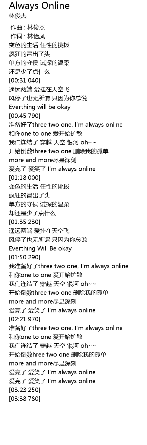 | [02:41.500] | zhǔn bèi hǎo le three two one, I' m always online |