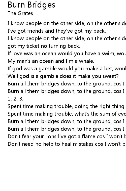 Burn all them bridges down, to the ground, cos I won't be coming this way again. |