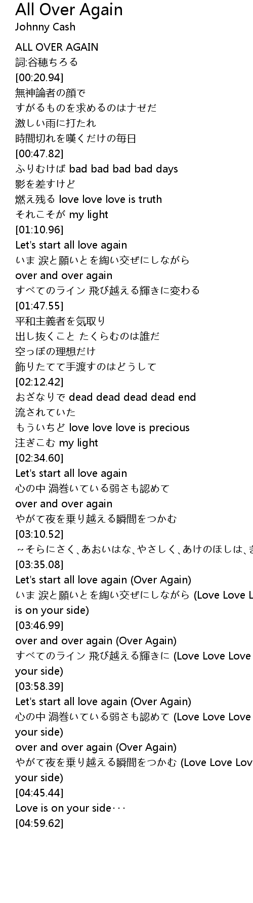 | [03:38.63] | いま 涙と願いとを綯い交ぜにしながら (Love Love Love is on your side) |