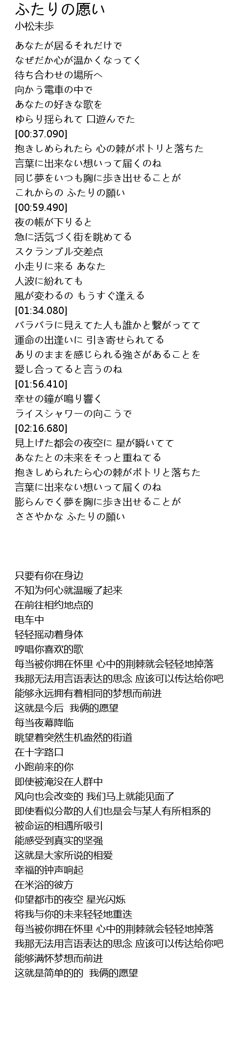 | [00:38.330] | 抱きしめられたら 心の棘がポトリと落ちた |