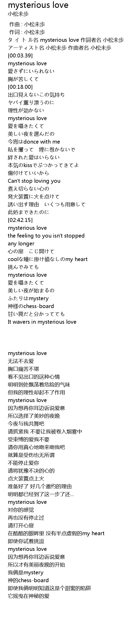 | [00:01.99] | タ イ ト ル名 mysterious love 作詞者名 小松未歩 |