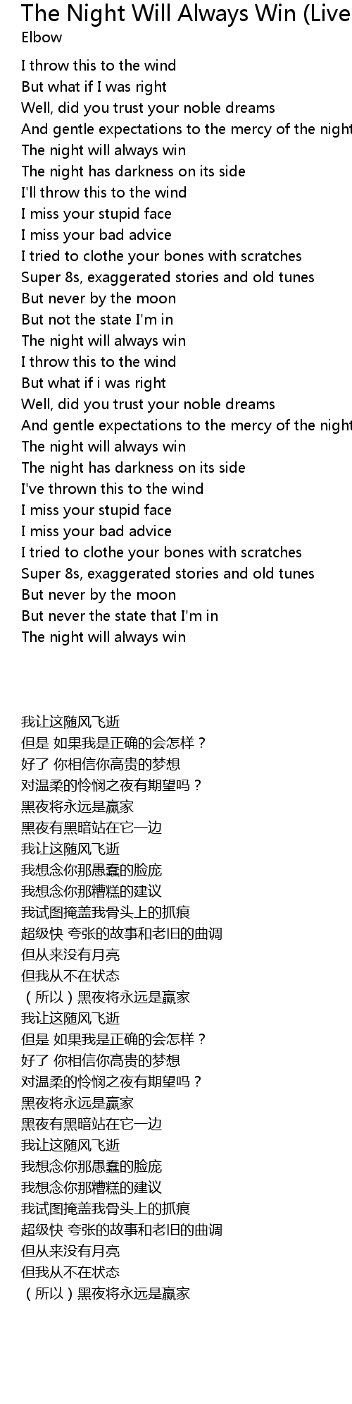 | [01:23.00] | And gentle expectations to the mercy of the night? |