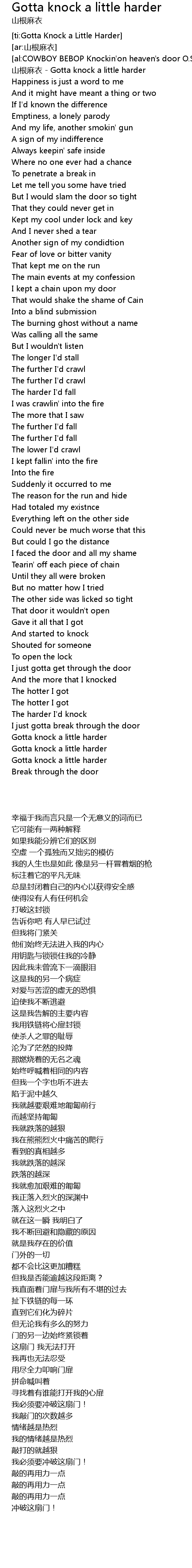 | [00:10.33] | shān gēn má yī Gotta knock a little harder |