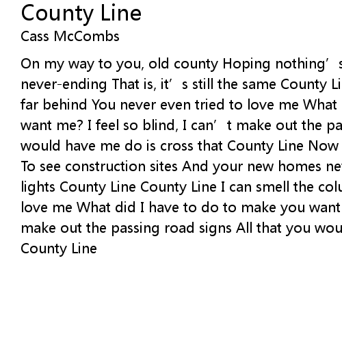 | On my way to you, old county Hoping nothing' s changed That your pain is neverending That is, it' s still the same County Line County Line I left so far behind You never even tried to love me What did I have to do to make you want me? I feel so blind, I can' t make out the passing road signs All that you would have me do is cross that County Line Now you know I' m coming, old county To see construction sites And your new homes neverending I think I can see the lights County Line County Line I can smell the columbine You never even tried to love me What did I have to do to make you want me? I feel so blind, I can' t make out the passing road signs All that you would have me do is cross that County Line |