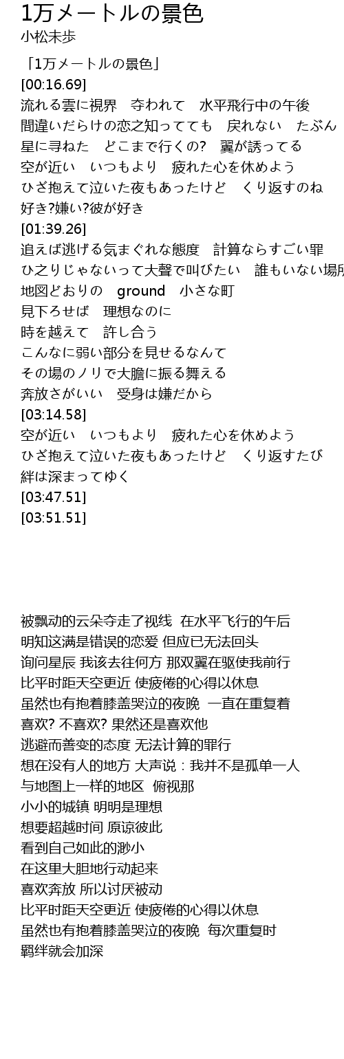 | [00:20.69] | 流れる雲に視界 夺われて 水平飛行中の午後 |