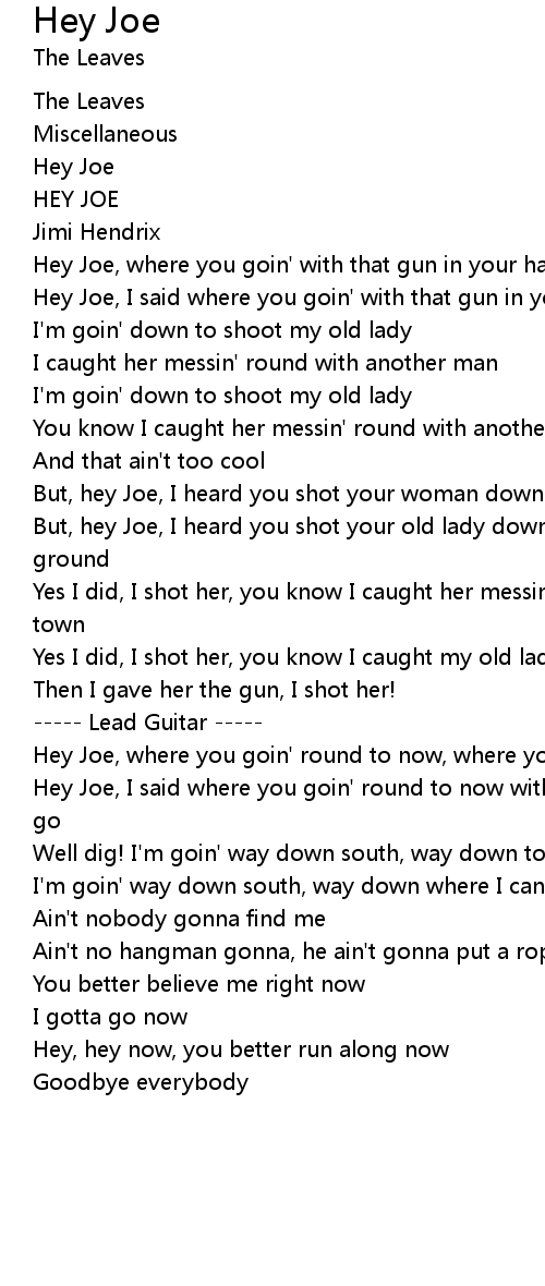 Hey Joe, I said where you goin' round to now with that gun, where you gonna |