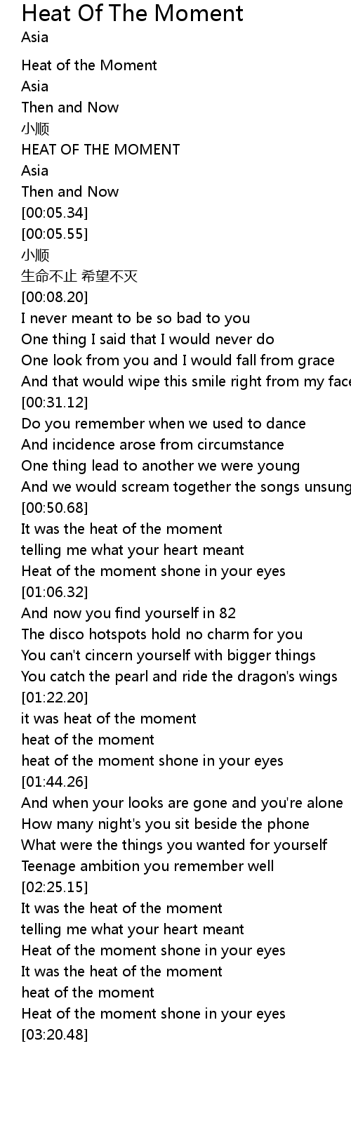 | [00:59.16] | Heat of the moment shone in your eyes |