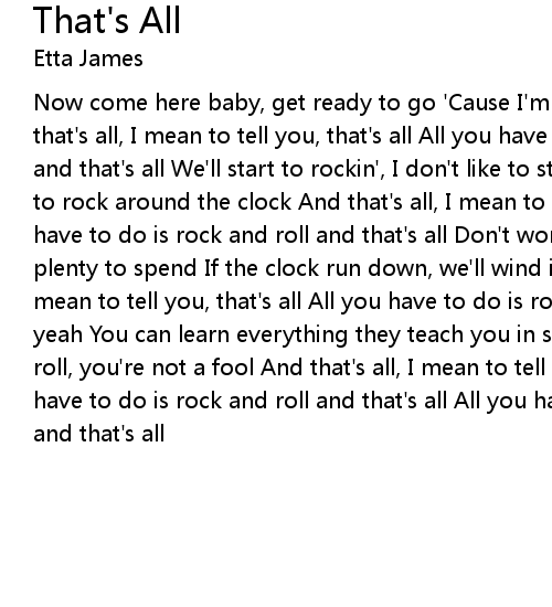 Now come here baby, get ready to go 'Cause I'm in the mood to rock and roll And that's all, I mean to tell you, that's all All you have to do is rock and roll and that's all We'll start to rockin', I don't like to stop You better get ready to rock around the clock And that's all, I mean to tell you, that's all All you have to do is rock and roll and that's all Don't worry about the time, I got plenty to spend If the clock run down, we'll wind it up again And that's all, I mean to tell you, that's all All you have to do is rock and roll and that's all, yeah You can learn everything they teach you in school But if you can't rock and roll, you're not a fool And that's all, I mean to tell you, that's all All you have to do is rock and roll and that's all All you have to do is rock and roll and that's all |