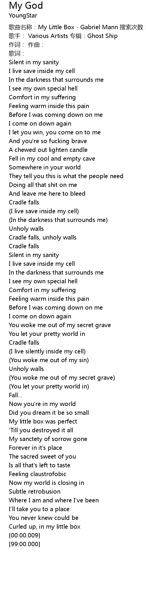 | [00:01.08] | ge qu ming cheng: My Little Box Gabriel Mann sou suo ci shu: 429 |