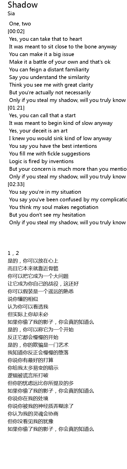 | [01:15] | Only if you steal my shadow, will you truly know |