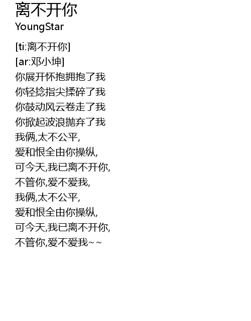 | [00:44.264] | kě jīn tiān, wǒ yǐ lí bù kāi nǐ, |