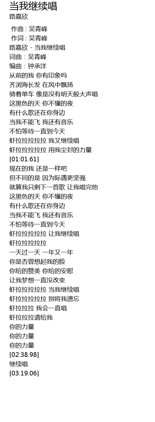 | [00:01.00] | 路嘉欣 - 当我继续唱 |