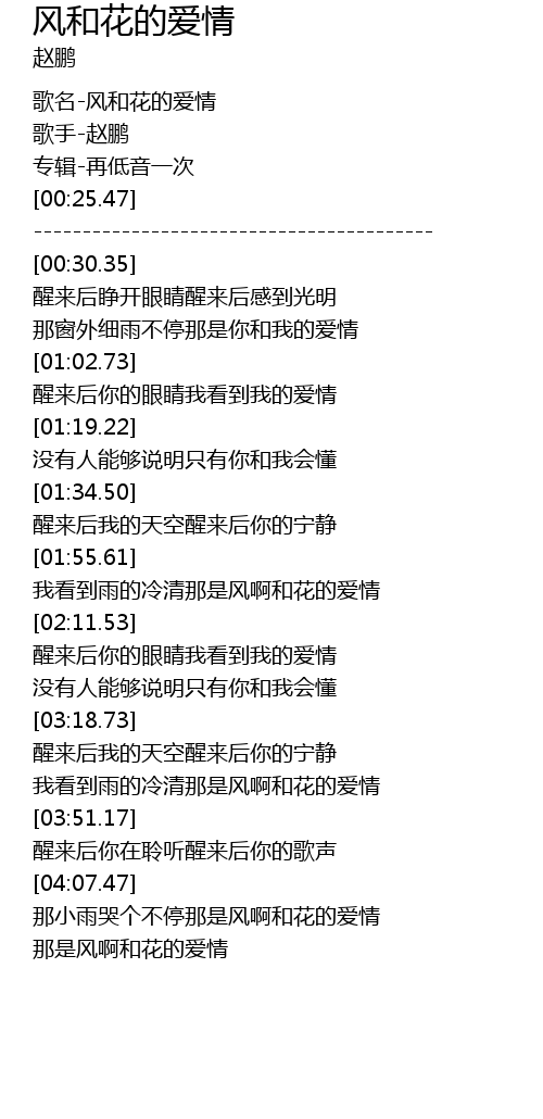 | [04:08.82] | 那小雨哭个不停那是风啊和花的爱情 |